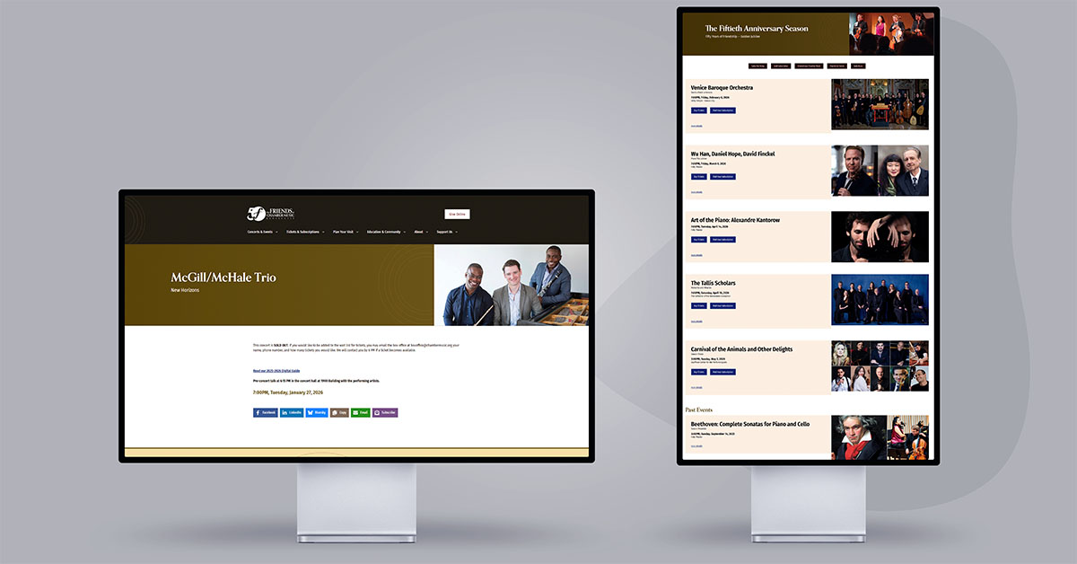 We focused on creating a refined user journey that balances the logistical needs of a high-volume box office with the storytelling required to showcase international artists. By prioritizing classic aesthetics and intuitive navigation, the new site makes it easy for patrons to explore season lineups, purchase subscriptions, and support the organization’s mission. The result is a professional digital home that elevates the FCM brand and strengthens its connection to the global classical music community.